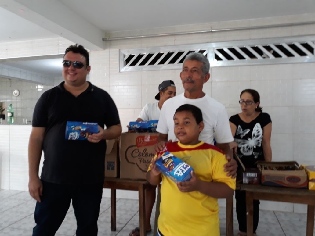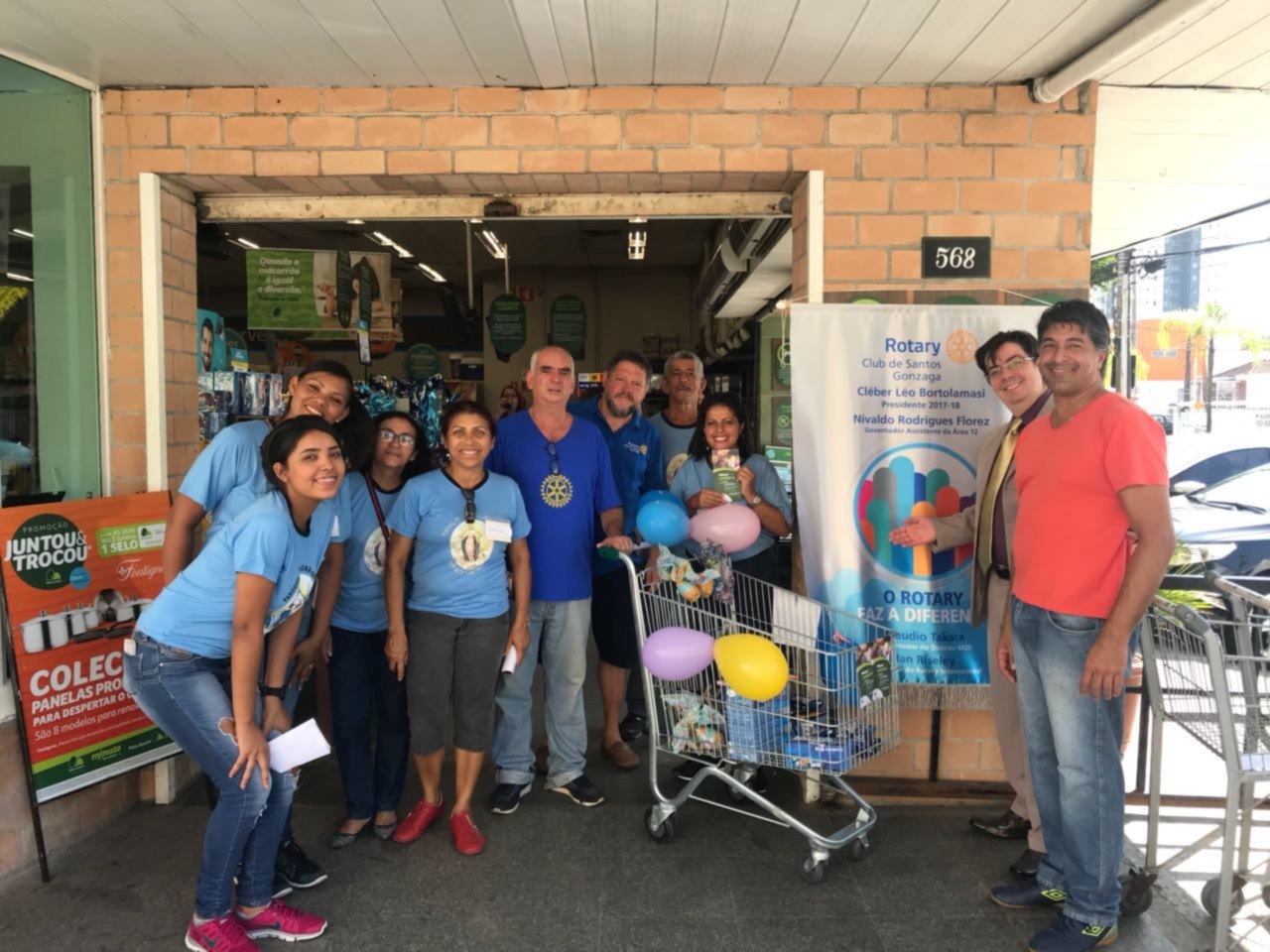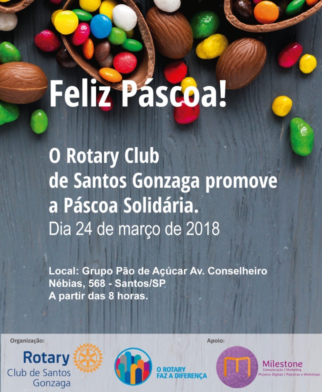 O Rotary Club de Santos Gonzaga realizou no sábado, dia 24 de março, a Páscoa Solidária, em parceria com o Grupo Pão de Açúcar. Com a participação de oito Companheiros, foram arrecadados 55 quilos de chocolates, que foram entregues para as crianças da Pastoral do Morro São Bento, em Santos.