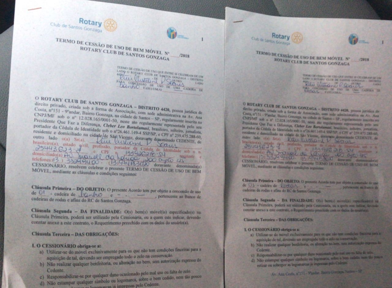 O Rotary Club de Santos Gonzaga, através do seu Banco de Cadeiras de Rodas Similares Eng. Antônio Carlos Cenedesi, realizou a entrega de mais dois equipamentos: uma cadeira de rodas e uma cadeira de banho. Os equipamentos atenderão uma senhora acidentada. A entrega foi feita na Cidade de São Vicente,na tarde de 4 de maio, atendendo um pedido da presidente que faz a diferença Julia Varandas, do Rotary Club de São Vicente.