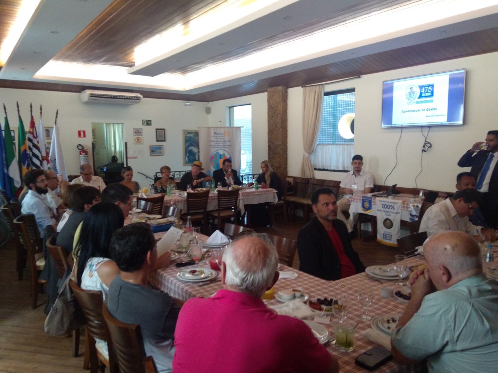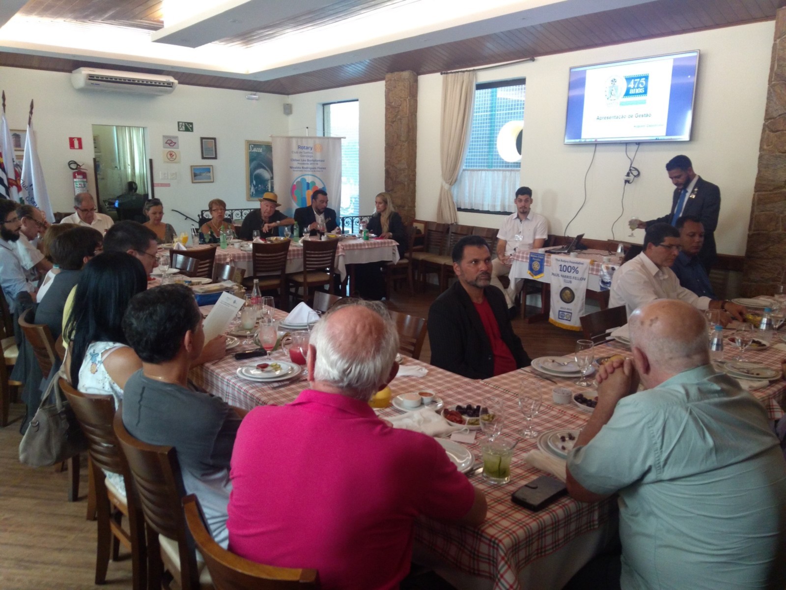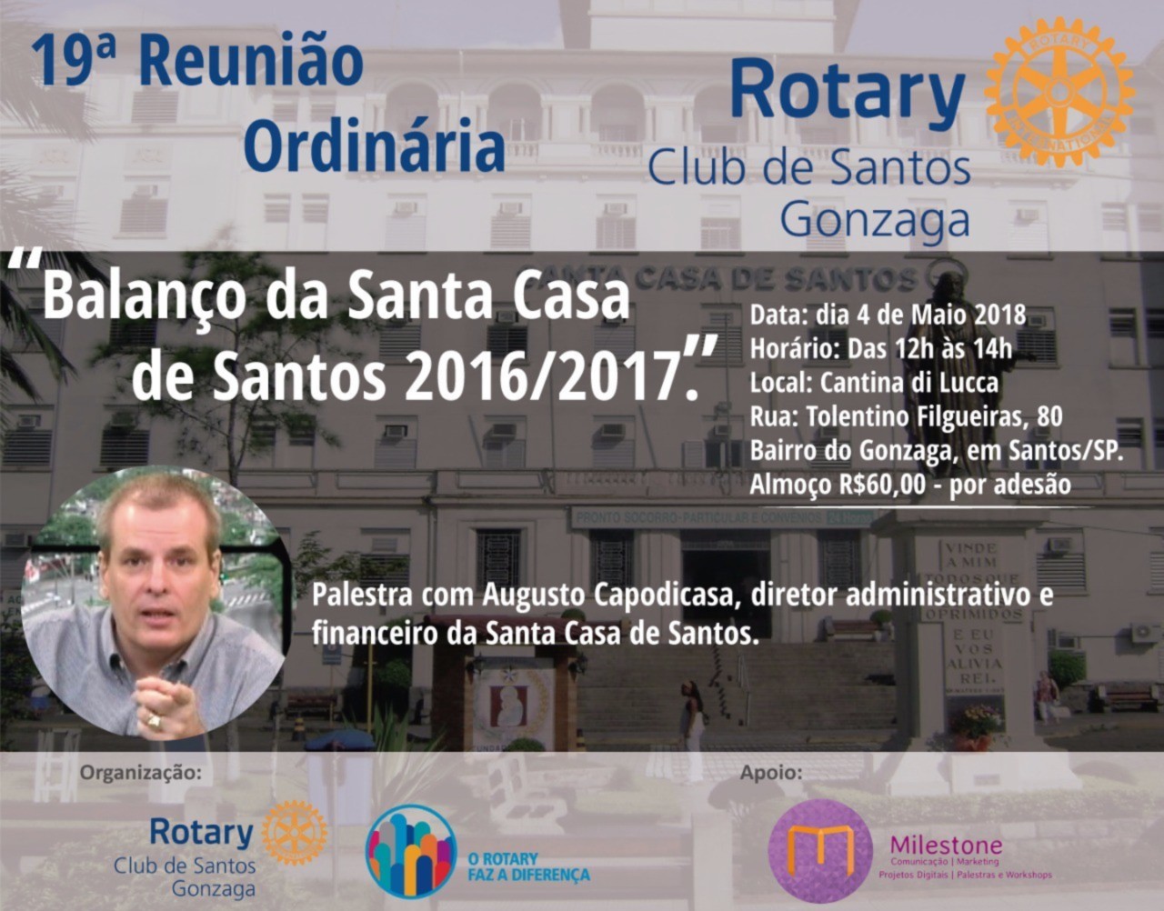 O Rotary Club de Santos Gonzaga realizou nessa sexta-feira, 4 de maio, a 19ª reunião ordinária, na Cantina di Lucca, em Santos, com a presença do diretor administrativo e financeiro da Santa Casa de Santos, Augusto Capodicasa, que fez um balanço desses últimos dois anos na gerência da entidade, que carrega o título de primeiro hospital das Américas, fundado por Brás Cubas. Momento de reflexão aconteceu no início da reunião, quando os mais de 30 convidados prestaram um minuto de silêncio pela passagem da nossa Companheira Teresinha Calçada, sócia honorária do Club.