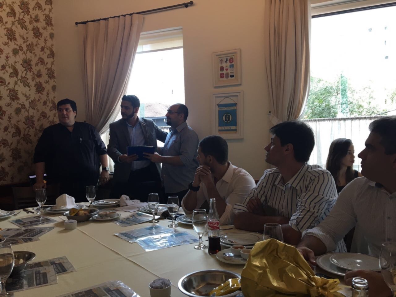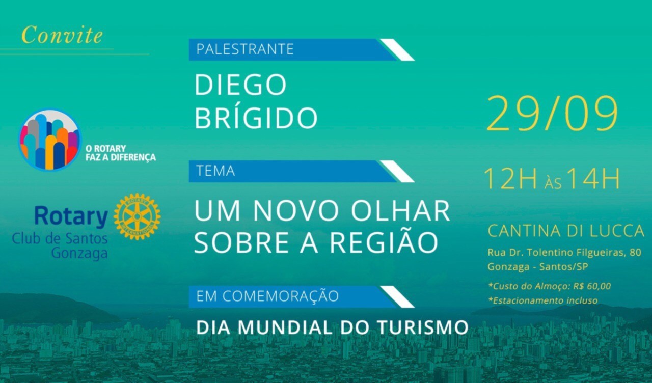 Em comemoração ao Dia Mundial do Turismo, o jornalista Diego Brígido ministrou palestra na 6ª reunião ordinária do Rotary Club de Santos Gonzaga, no dia 29 de setembro, na Cantina di Lucca, com o tema Um novo olhar sobre a região. Na reunião, foi admitido o novo sócio Fabian Furrier e recebido um andador do Rotary Club de Santos Noroeste para o Banco de Cadeiras de Rodas Similares Eng. Antonio Carlos Cenedesi. Antes que a reunião chegasse ao fim, tinha mais surpresas: o Companheiro Vinicius recebeu um bolo dos sócios e comemorou seu aniversário