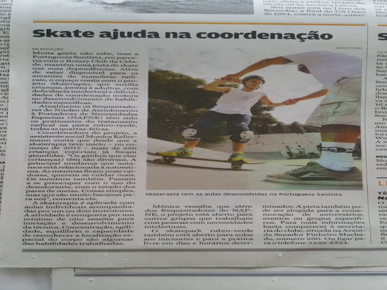 Algumas notícias que que saíram no jornal sobre o projeto que o Rotary club Santos Gonzaga apoia do Projeto Skate Terapia (Desenvolvimento da autodeterminação, equilíbrio, propriocepção, inclusão e auto estima através do segundo esporte mais praticado no país, o skate).