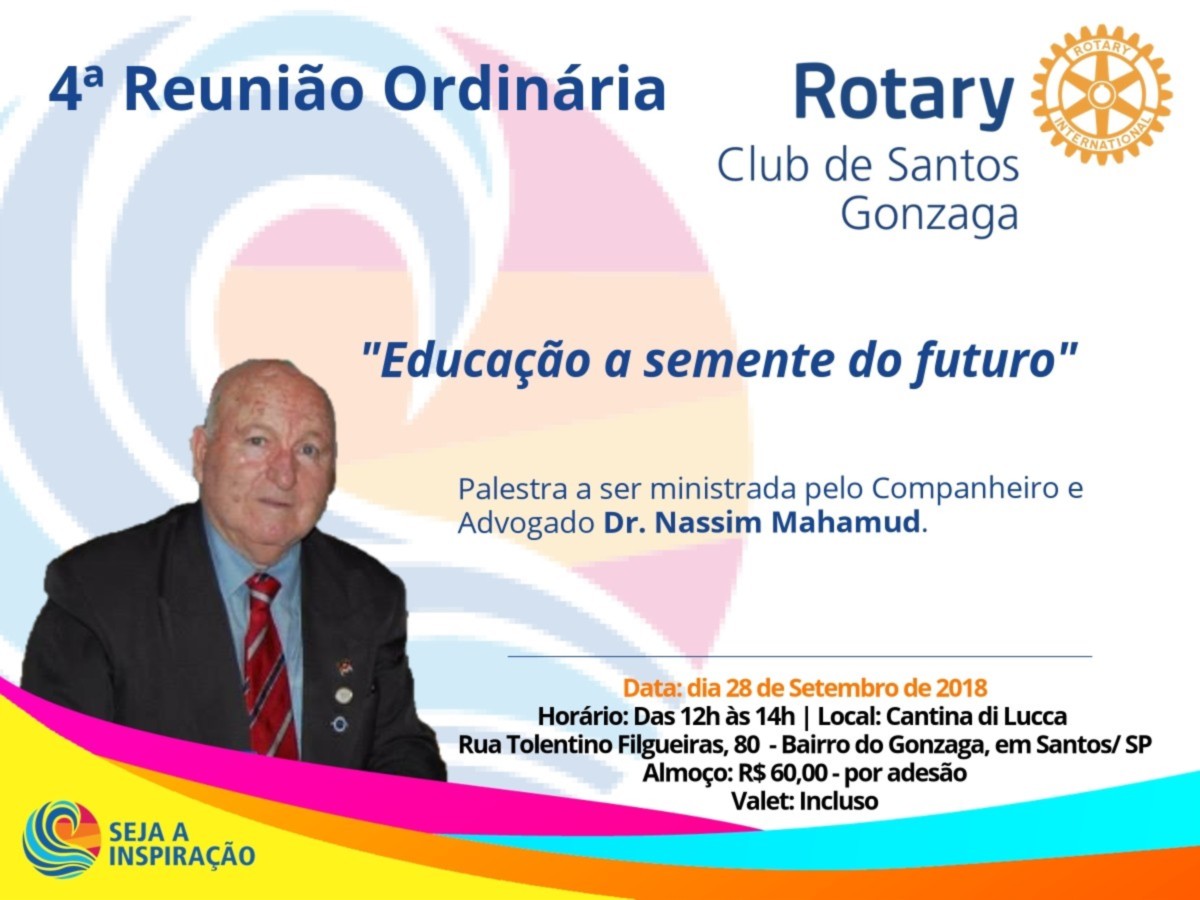 A quarta reunião ordinária do Rotary Club de Santos Gonzaga, realizada excepcionalmente no Spazio Villa Rica, no início da tarde de 30 de setembro, teve a palestra do Companheiro Nassim Mahamud, que falou sobre a Educação, uma semente do futuro.