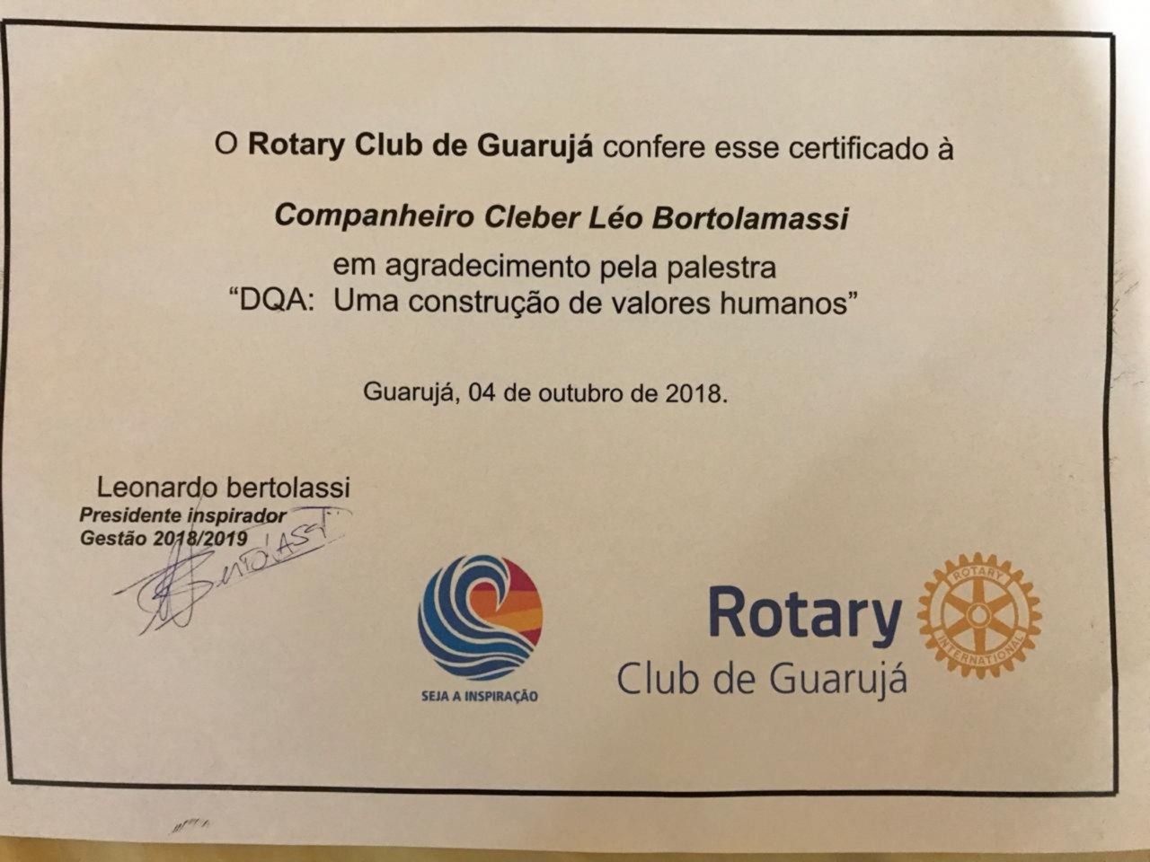 Nosso diretor da fundação Rotary, Cléber Léo Bortolamasi, aceita o convite do presidente inspirador Leonardo Bertolassi que, desde o encontro na Conferência Distrital, estreitaram o companheirismo. Recebido com um feijoada inspiradora. O então companheiro do Rotary Club de Santos Gonzaga Cléber Léo Bortolamasi, vai então para na missão de levar e entregar conhecimento, com suas palavras. Essa palestra DQA Uma construção de valores humanos.