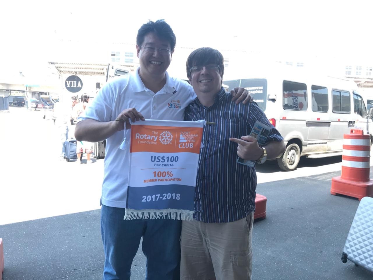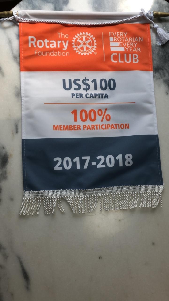 Antes de embarcar para um Cruzeiro , o governador que faz a diferença Cláudio Takata, nosso sócio honorário, entrega-nos a flâmula de 100 EREY, ou seja, em 2017/2018 o Club foi 100 de doação de U$ 100,00 de cada Companheiro. Flâmula conquistada pela primeira vez pelo Rotary Club de Santos Gonzaga.