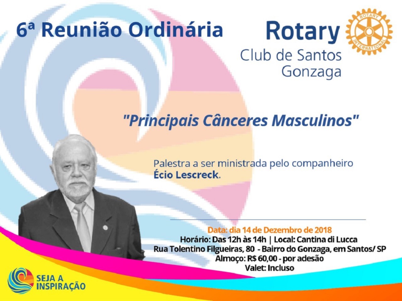 A 6ª Reunião Ordinária do Rotary Club de Santos Gonzaga, ocorreu no dia 14 de dezembro de 2018, às 12 horas, na Cantina di Lucca como de costume. Uma palestra maravilhosa de nosso sócio honorário, Écio Lescreck.