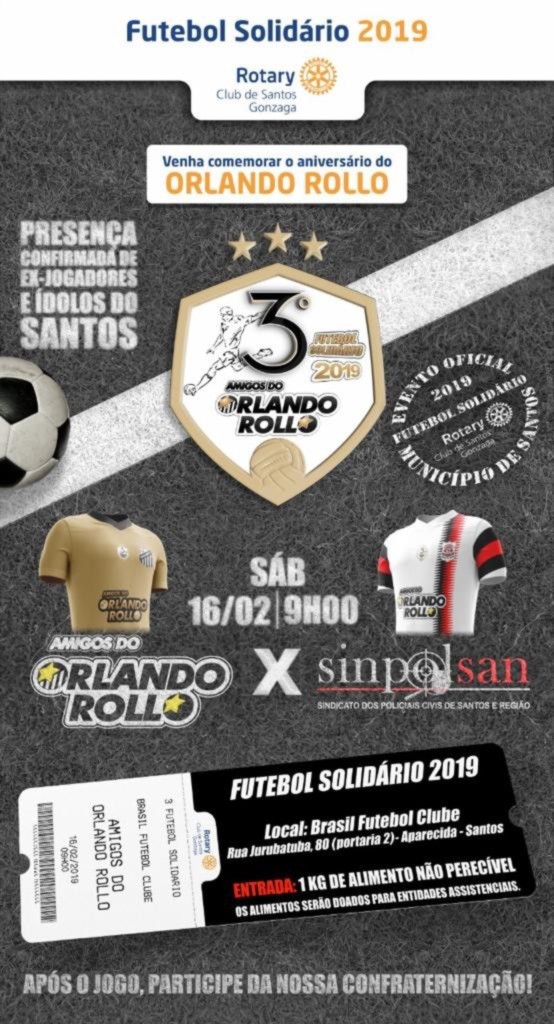 Graças aos esforços do vice presidente do Santos Orlando Rollo e sócio fundador do Rotary Club de Santos Gonzaga, ao Santos futebol clube, presidente André Cara, diretor da fundação rotária Cléber Léo e aos demais integrantes da diretoria teremos essa atividade maravilhosa que é o futebol solidário.