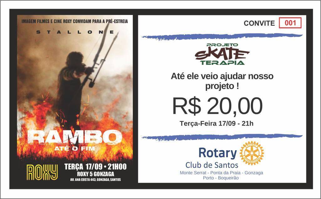 Sessão de cinema, no Roxy 5 Gonzaga, dia 17 de setembro, às 21h00 em prol do Projeto Skate Terapia, com o apoio do Rotary Club de Santos Gonzaga.